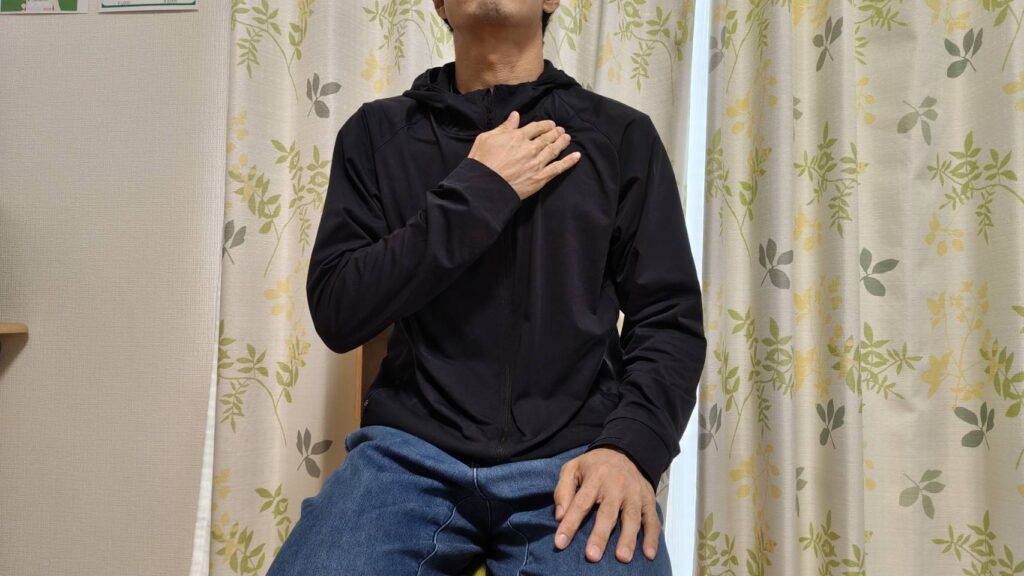 猫背で下を向いたまま深呼吸 → 次に、軽く胸を張って深呼吸。