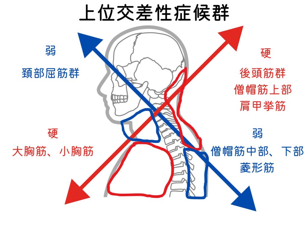 首の後ろ側・胸の筋肉が硬くなる状態で、